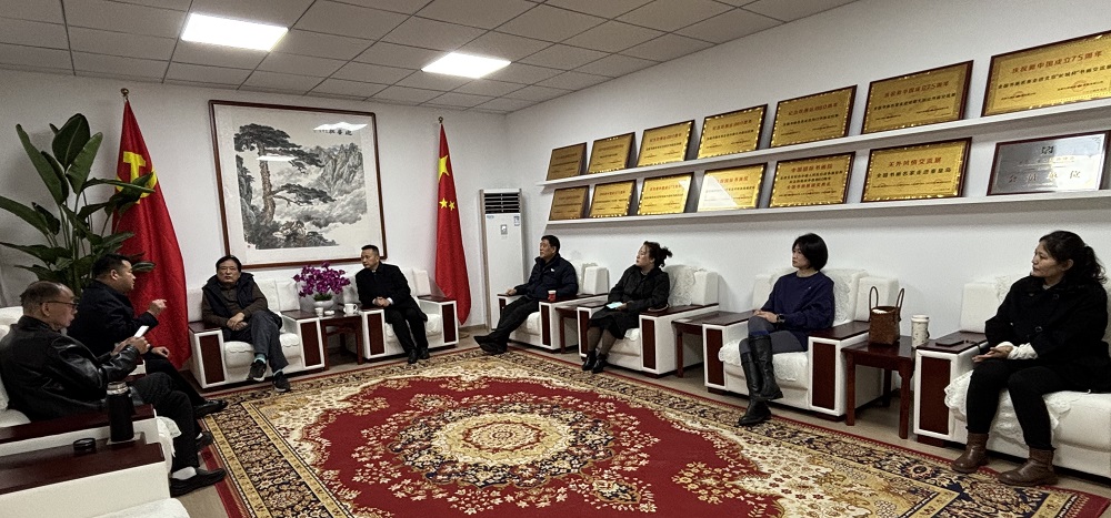 (本院讯)2026年3月21日下午,民盟安徽省委宣传部部长何辉、民盟安徽书画院执行院长葛红千等企业家一行六人,应邀前来中国国际书画院、北京大夏国际书画院合肥运营总部参观并指导工作,执行院长王成、副院长兼教育部部长许梅生和副院长兼花鸟部部长周立安等院领导热情接待来访领导。